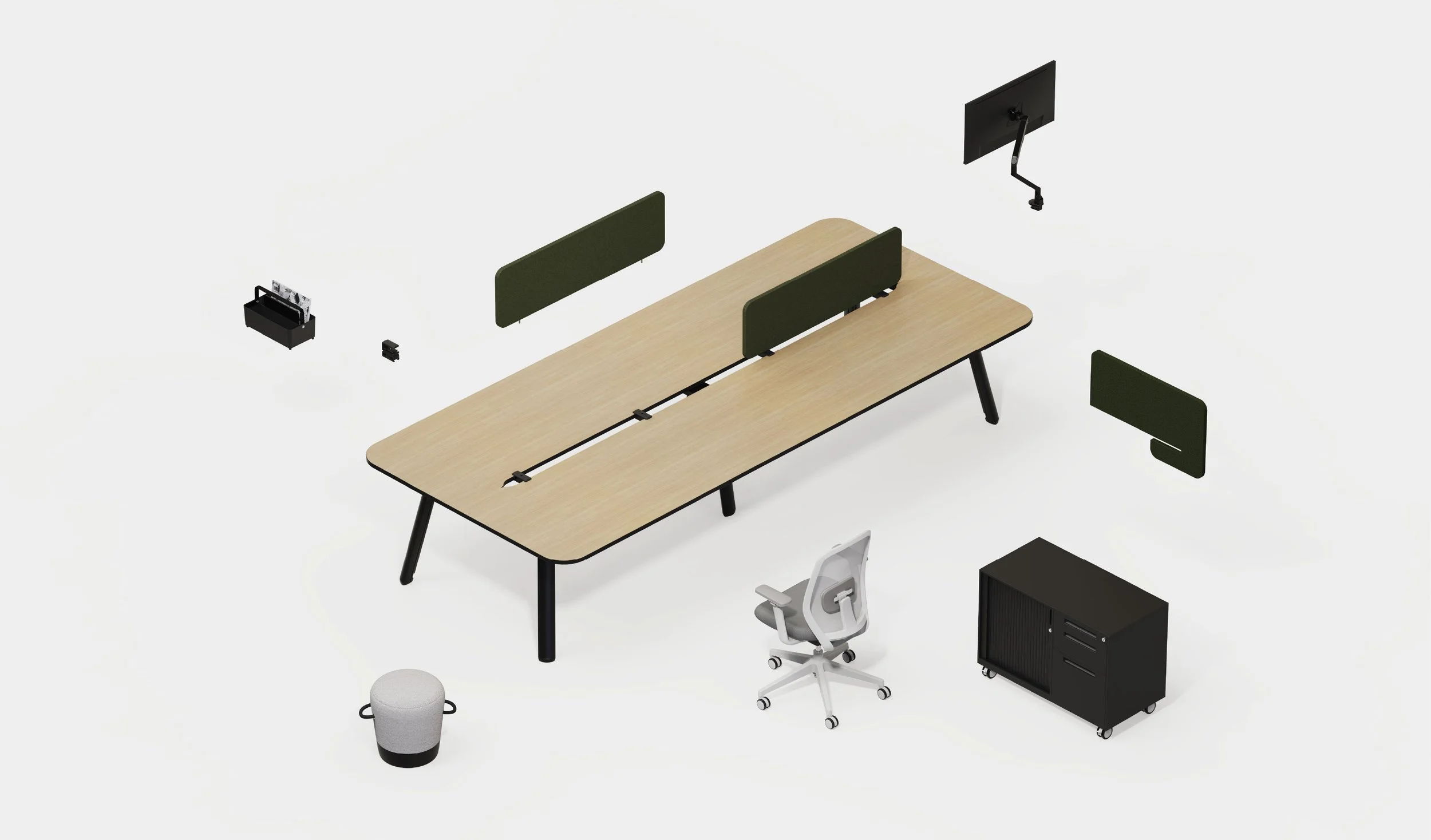 The refined, one-piece extruded sub-frame supports four-metre tops with only four legs. This long-span structure not only maximises seating positions around the table, but also grants workpoint freedom and workplace flow.